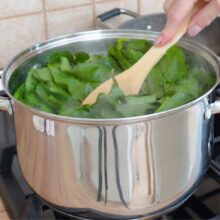 Spălați bine ștevia, îndepărtați nervurile groase și opăriți frunzele 2-3 minute în apă clocotită cu sare. Clătiți-le cu apă rece, apoi tocați-le grosier.